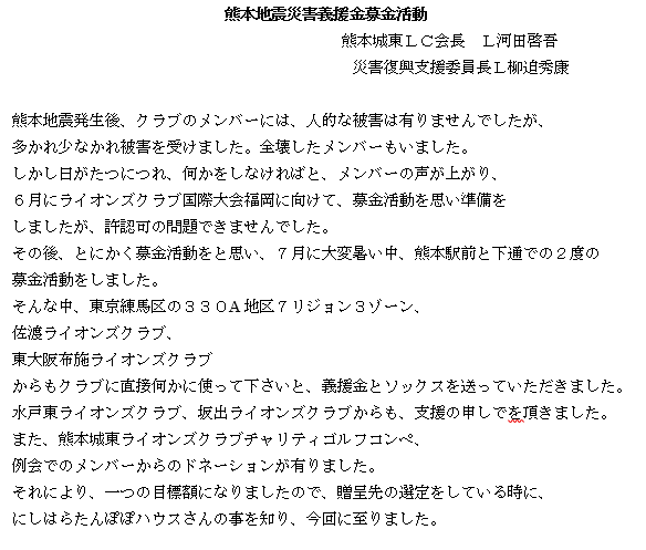 「たんぽぽハウスの宿泊施設を建築中です。その施設の装備・設備代として使わせていただきます。」との施設長からの説明でした。
