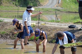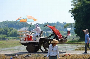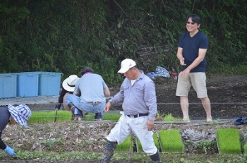 そちらの方も植えなさい!(ライオンのお母さんは田んぼの外で檄を飛ばしています)